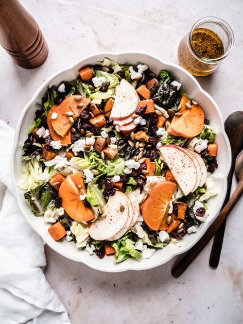 Try this delicious Holiday Persimmon Salad created for us by Nicole Triebe. Featuring sweet and tender textures from Fresh Express® Sweet Butter with added sweet potato, dried cranberries, goats cheese, apples and persimmons, it’s bursting with delicious winter flavors.