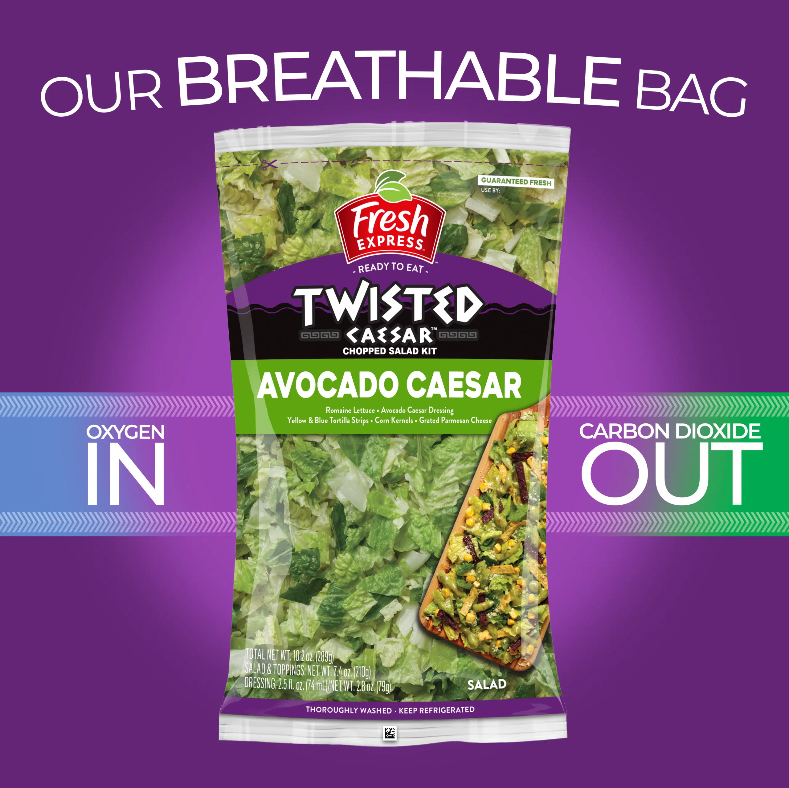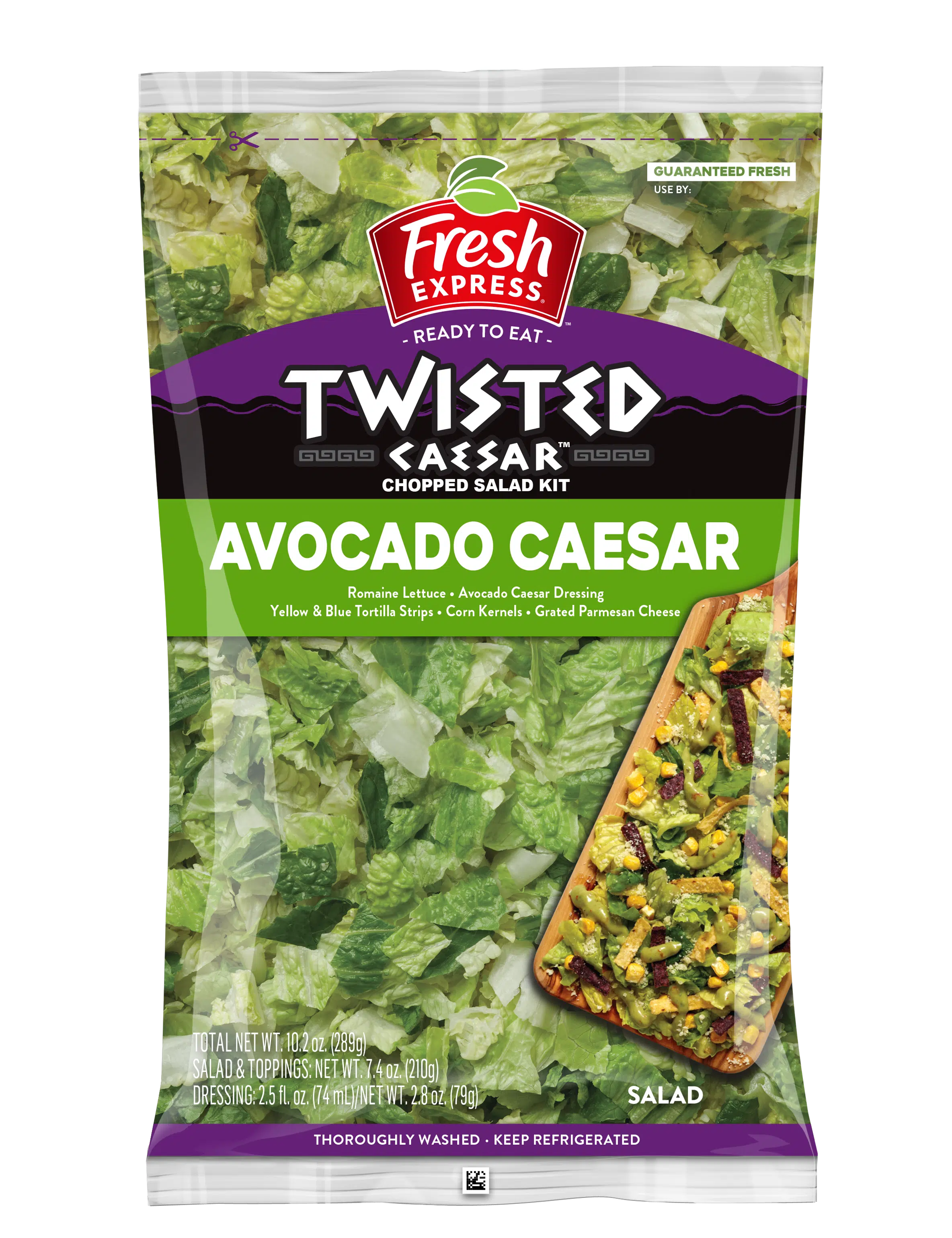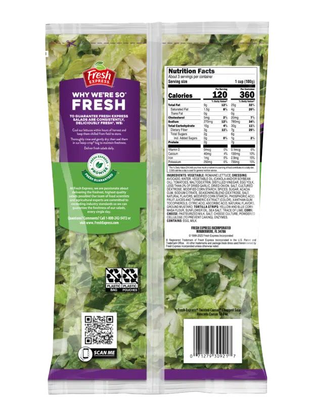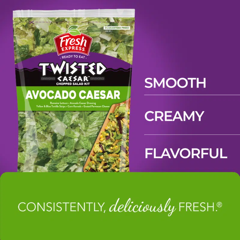 Fresh Express has combined two fan favorites, fresh avocado, and zesty Caesar salad have just been twisted! Our new avocado caesar chopped salad kit brings on the fresh flavor you love with sweet corn kernels, crunchy tortilla strips, and nutty parmesan cheese, dressed in smooth avocado Caesar dressing for a fantastically flavorful new take on an old classic.
