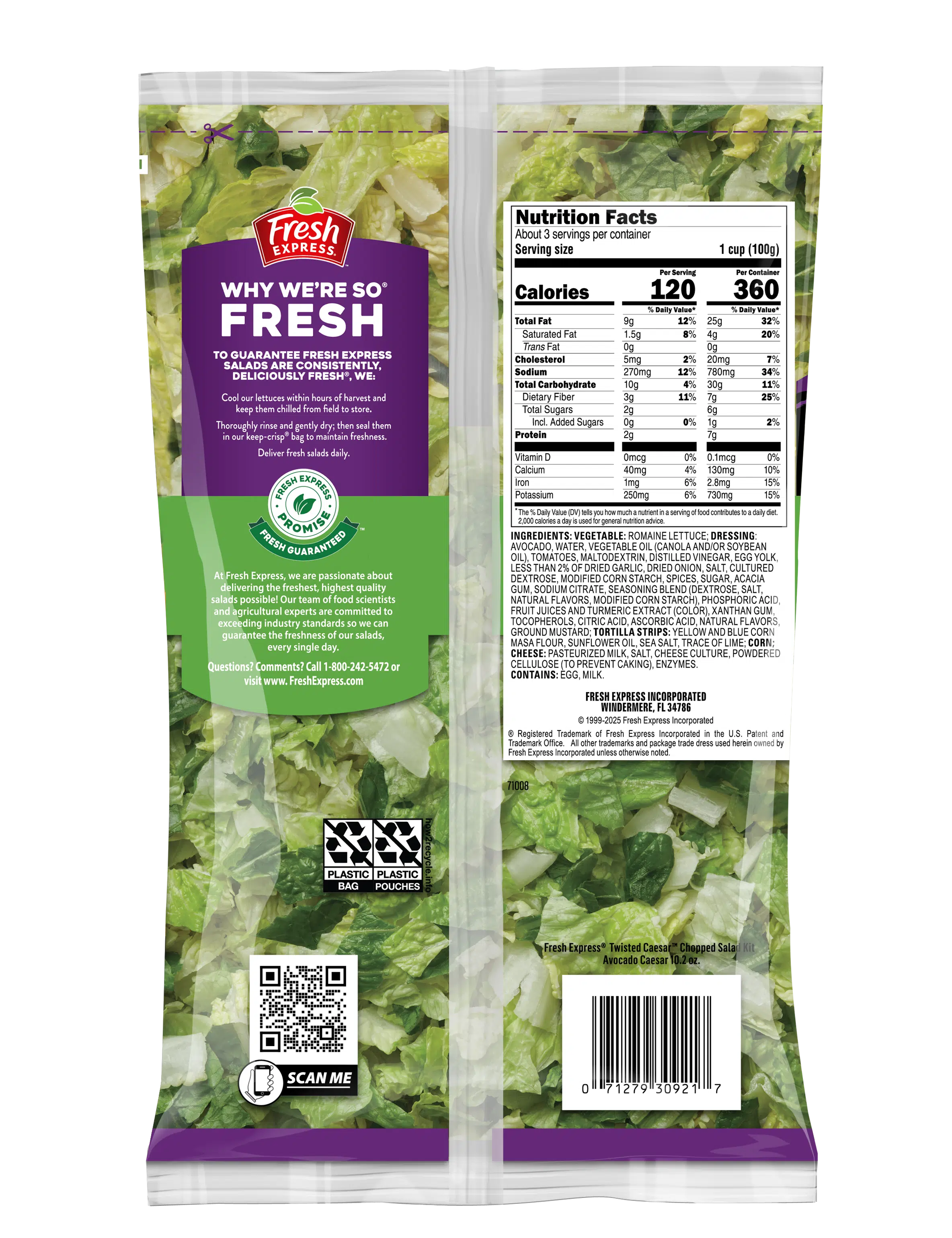 VEGETABLE: ROMAINE LETTUCE; DRESSING: AVOCADO, WATER, VEGETABLE OIL (CANOLA AND/OR SOYBEAN OIL), TOMATOES, MALTODEXTRIN, DISTILLED VINEGAR, EGG YOLK, LESS THAN 2% OF DRIED GARLIC, DRIED ONION, DRIED RED PEPPER, SALT, CULTURED DEXTROSE, MODIFIED CORN STARCH, SPICES, SUGAR, ACACIA GUM, SODIUM CITRATE, SEASONING BLEND (DEXTROSE, SALT, NATURAL FLAVORS, MODIFIED CORN STARCH), PHOSPHORIC ACID, FRUIT JUICES AND TURMERIC EXTRACT (COLOR), XANTHAN GUM, TOCOPHEROLS, CITRIC ACID, ASCORBIC ACID, NATURAL FLAVORS, MUSTARD FLOUR; TORTILLA STRIPS: STONE GROUND YELLOW AND BLUE CORN, SUNFLOWER OIL, SALT, TRACE OF LIME; CORN; CHEESE: PASTEURIZED MILK, SALT, CHEESE CULTURE, POWDERED CELLULOSE (TO PREVENT CAKING), ENZYMES, SORBIC ACID (PRESERVATIVE). CONTAINS: EGG, MILK.
