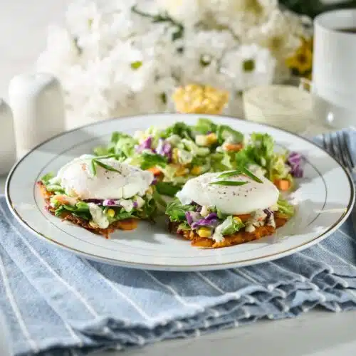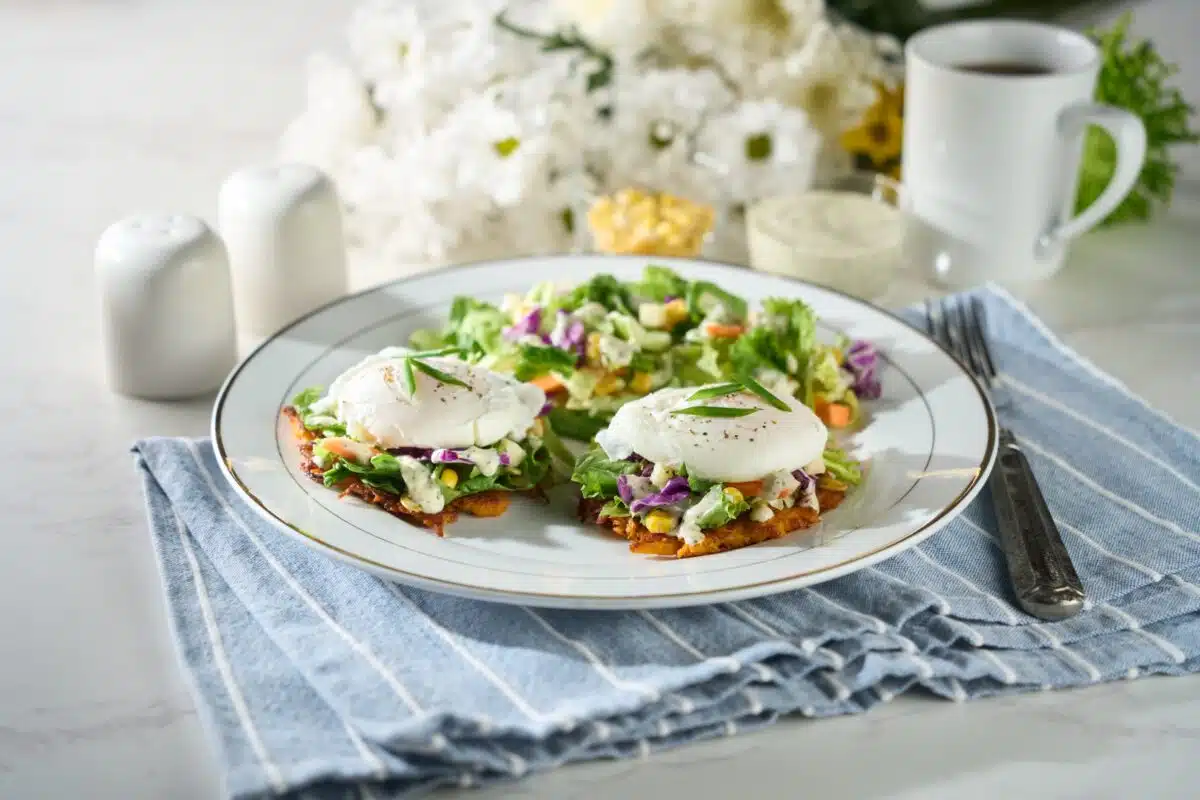 Crisp potato latkes topped with a poached egg and a cool, creamy drizzle from the Fresh Express® Creamy Goddess Chopped Kit—brunch comfort with fresh crunch.