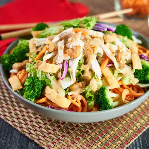 It’s easy to make a restaurant quality Thai dish with the Fresh Express® Thai ‘N’ Cashews Chopped Kit®. Just purchase prepared sweet potato noodles, prepared rotisserie chicken and steam some broccoli and this meal comes together quickly.