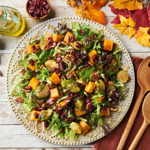 A blend of tender and crunchy lettuce topped with roasted squash and Brussels sprouts drizzled with a maple pumpkin vinaigrette is the perfect dish for fall.
