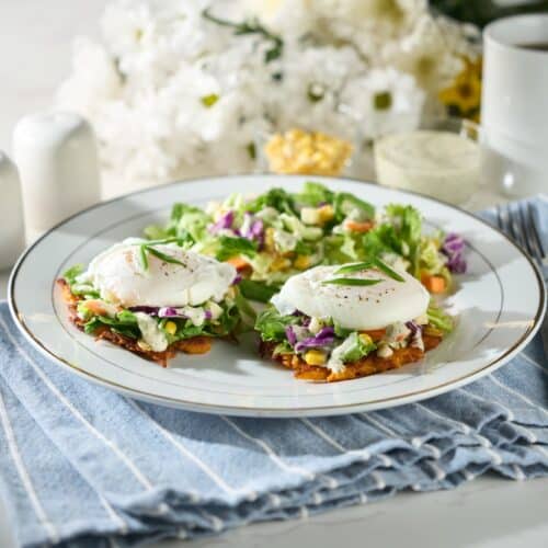Place 2 latkes on each plate. Top each with a small mound of the prepared salad and a poached egg. Drizzle with the reserved dressing and season with salt and black pepper.